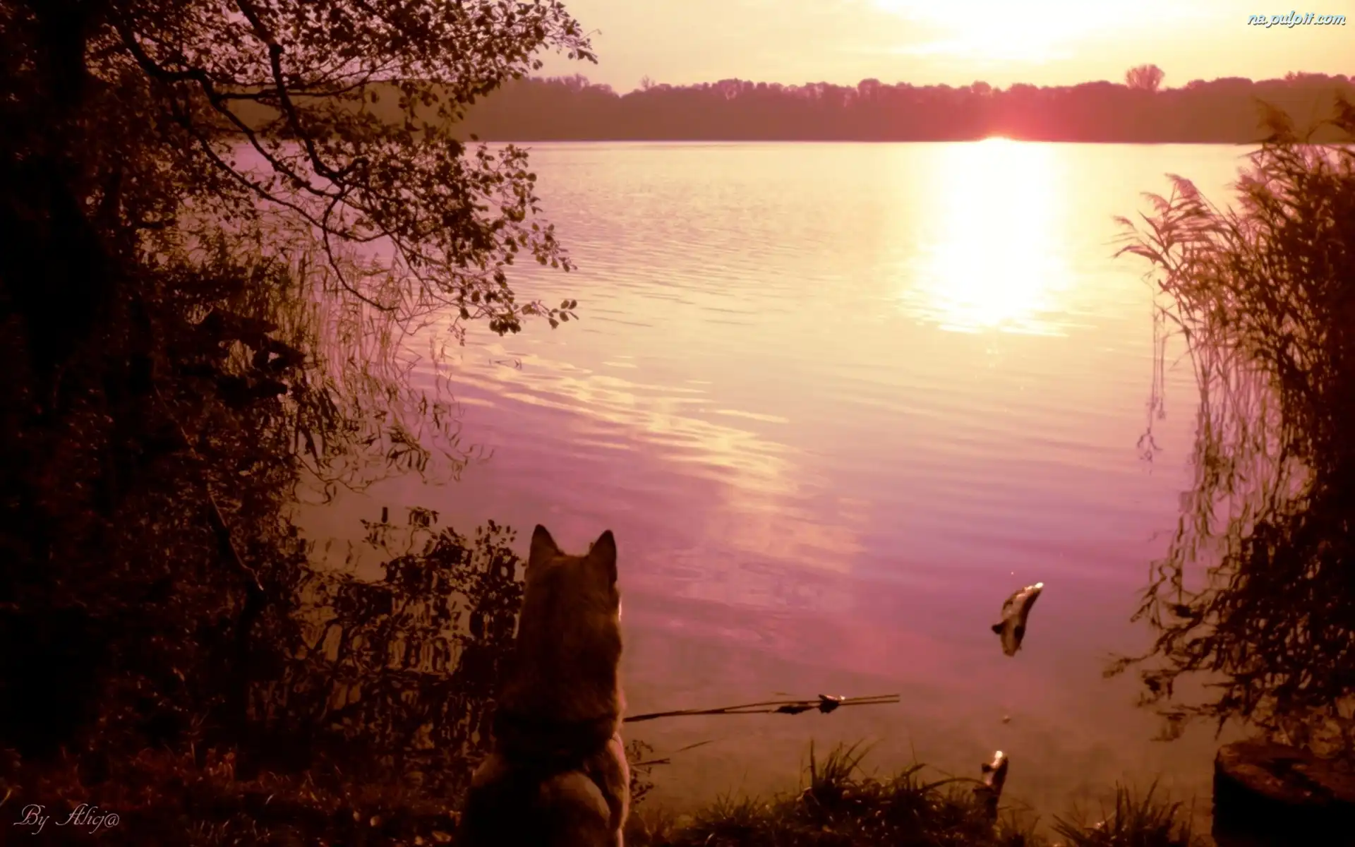 Szuwary, Słońca, Zachód, Jezioro, Pies Na Pulpit