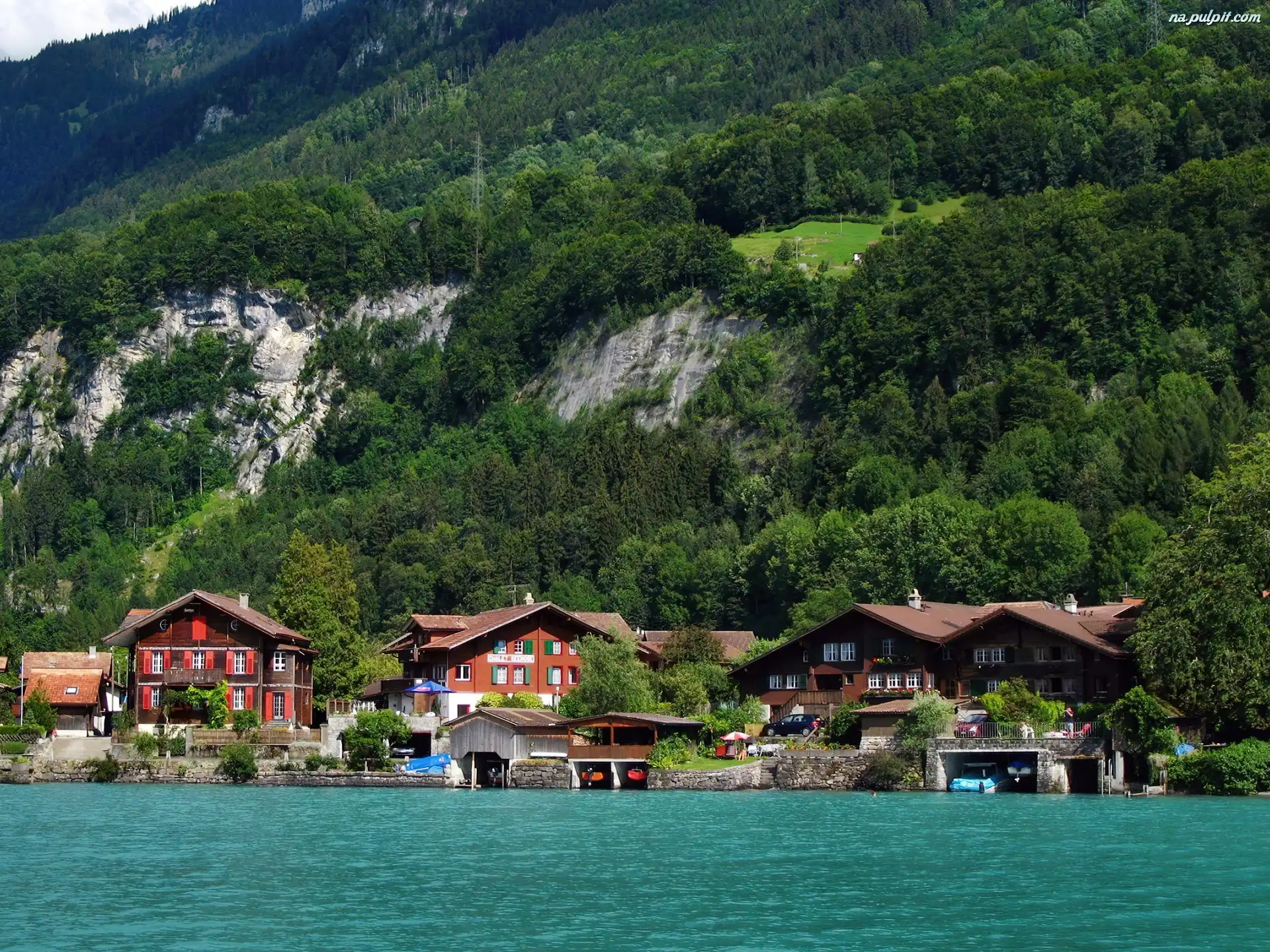 Szwajcaria, Domy, Góry, Jezioro Na Pulpit