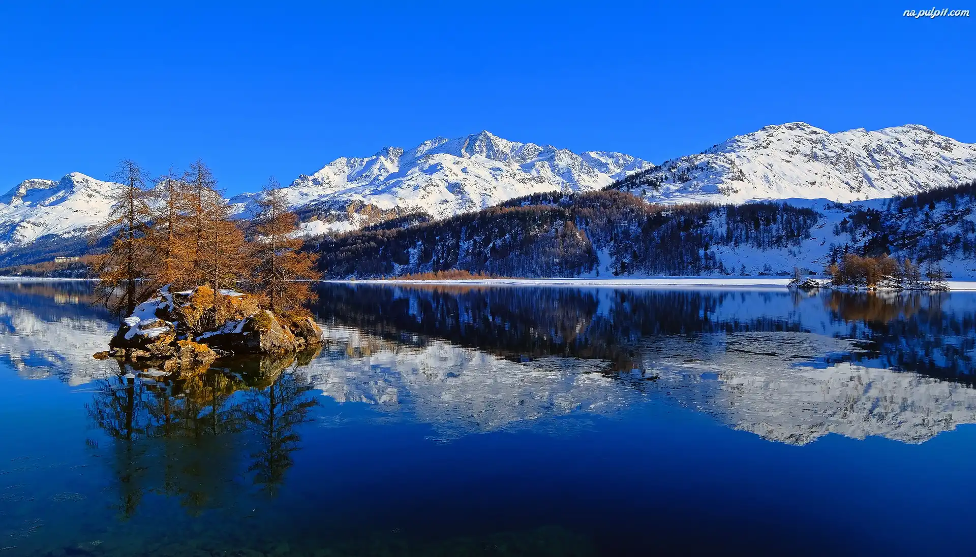 Odbicie, Szwajcaria, Drzewa, Góry, Zima, Jezioro Bergsee, Wyspa Na Pulpit