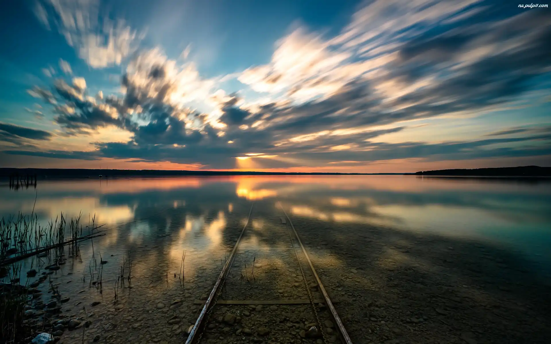 Niebo, Szyny, Odbicie, Chmury, Jezioro, Zachód słońca