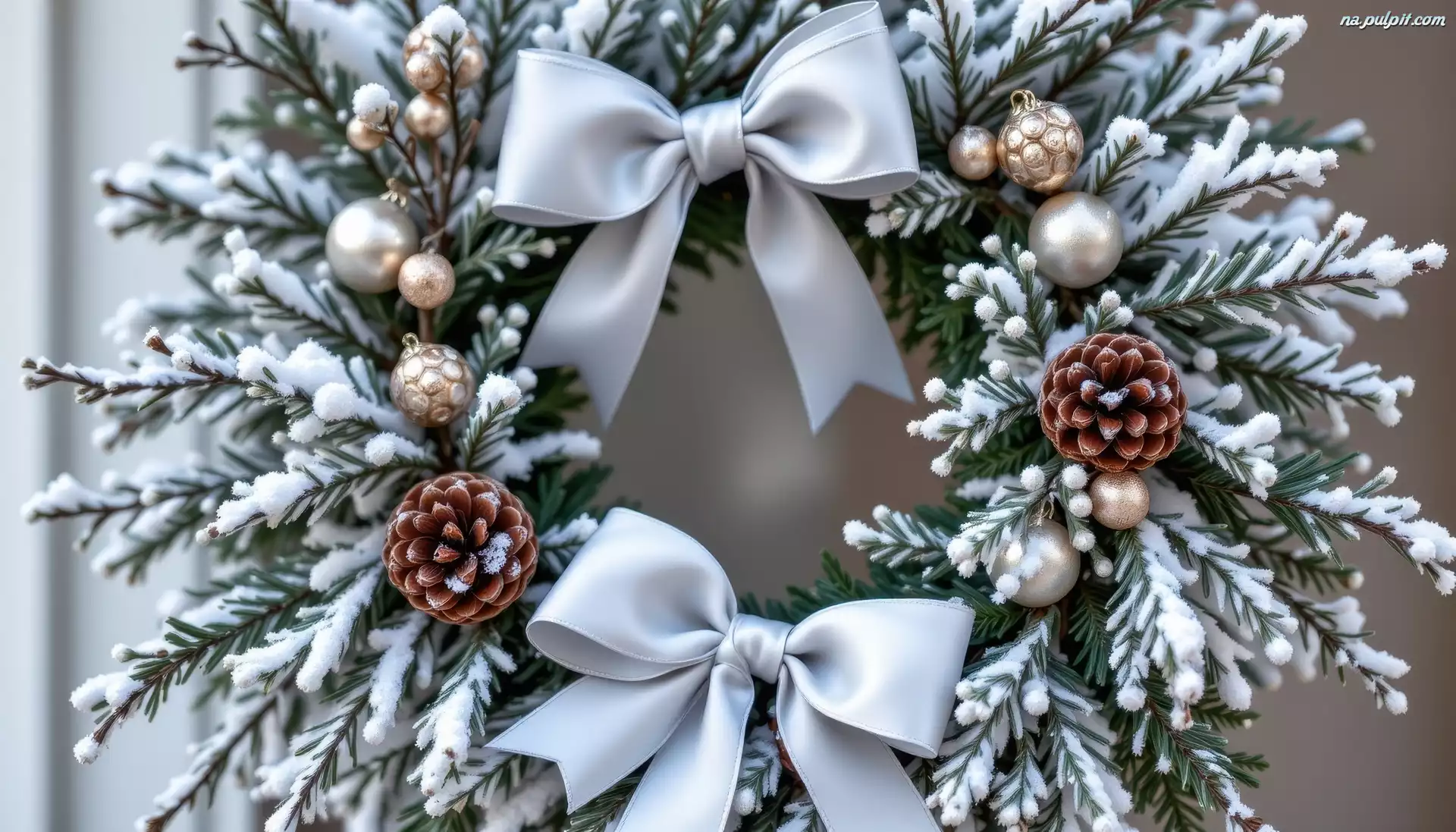 Szyszki, Gałązki, Kokardy, Boże Narodzenie, AI, Bombki, Wianek, Ośnieżone Na Pulpit