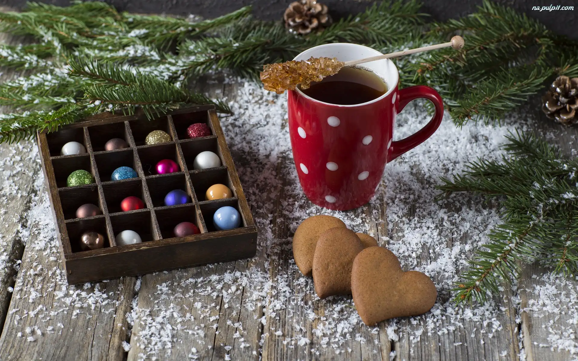 Kubek, Serca, Szyszki, Herbata, Bombki, Boże Narodzenie, Kompozycja, Pierniczki, Gałązki, Pudełko Na Pulpit |