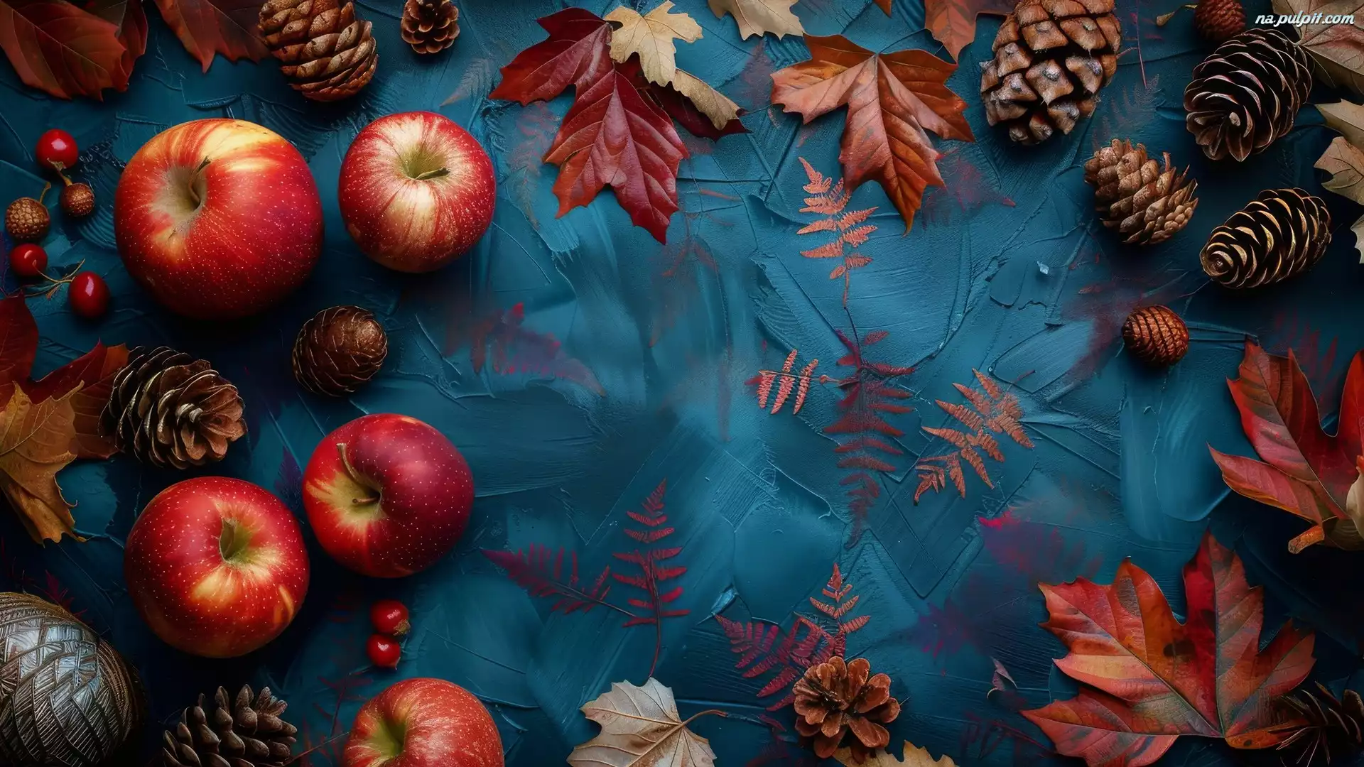 Czerwone, Jabłka, Listki, Kompozycja, Paprocie, Klonu, Czerwone, Szyszki Na Pulpit