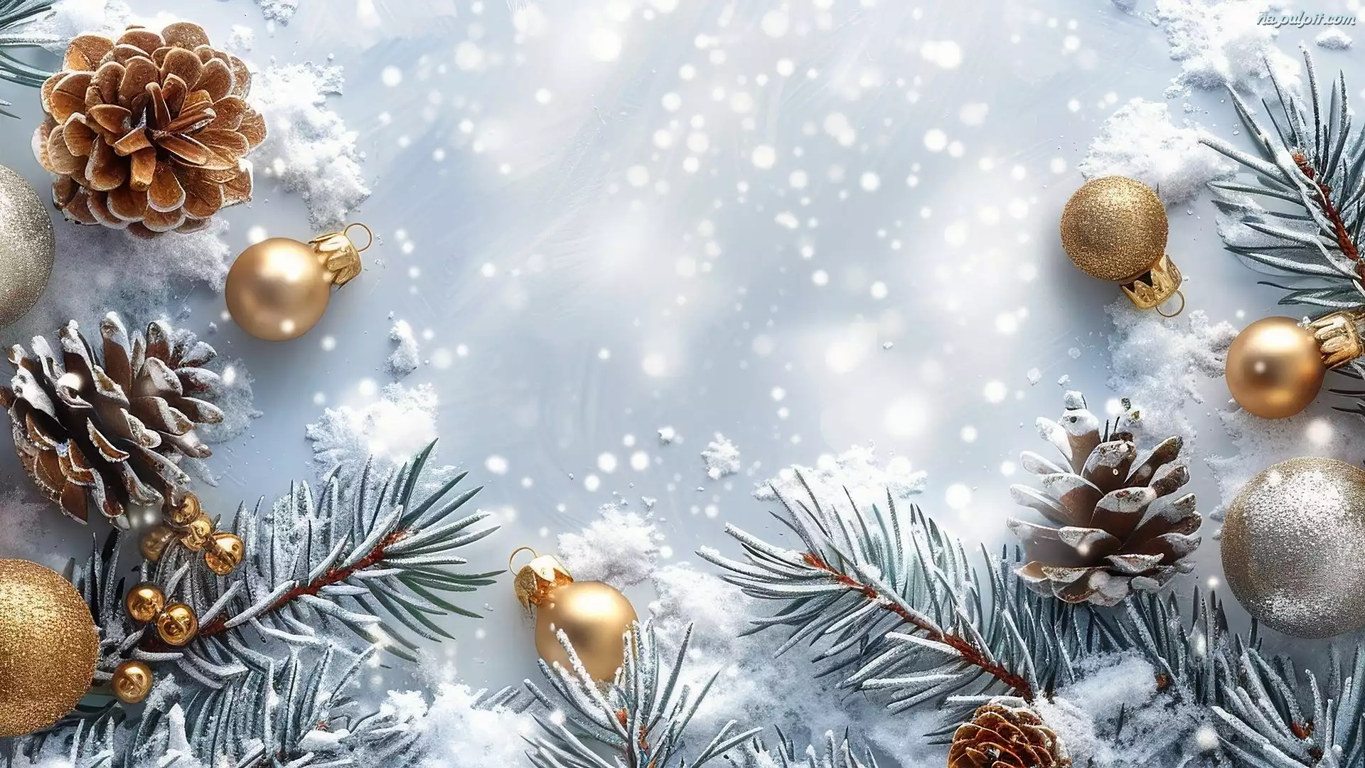Śnieg, Boże Narodzenie, Szyszki, Gałęzie, Bombki, Kompozycja