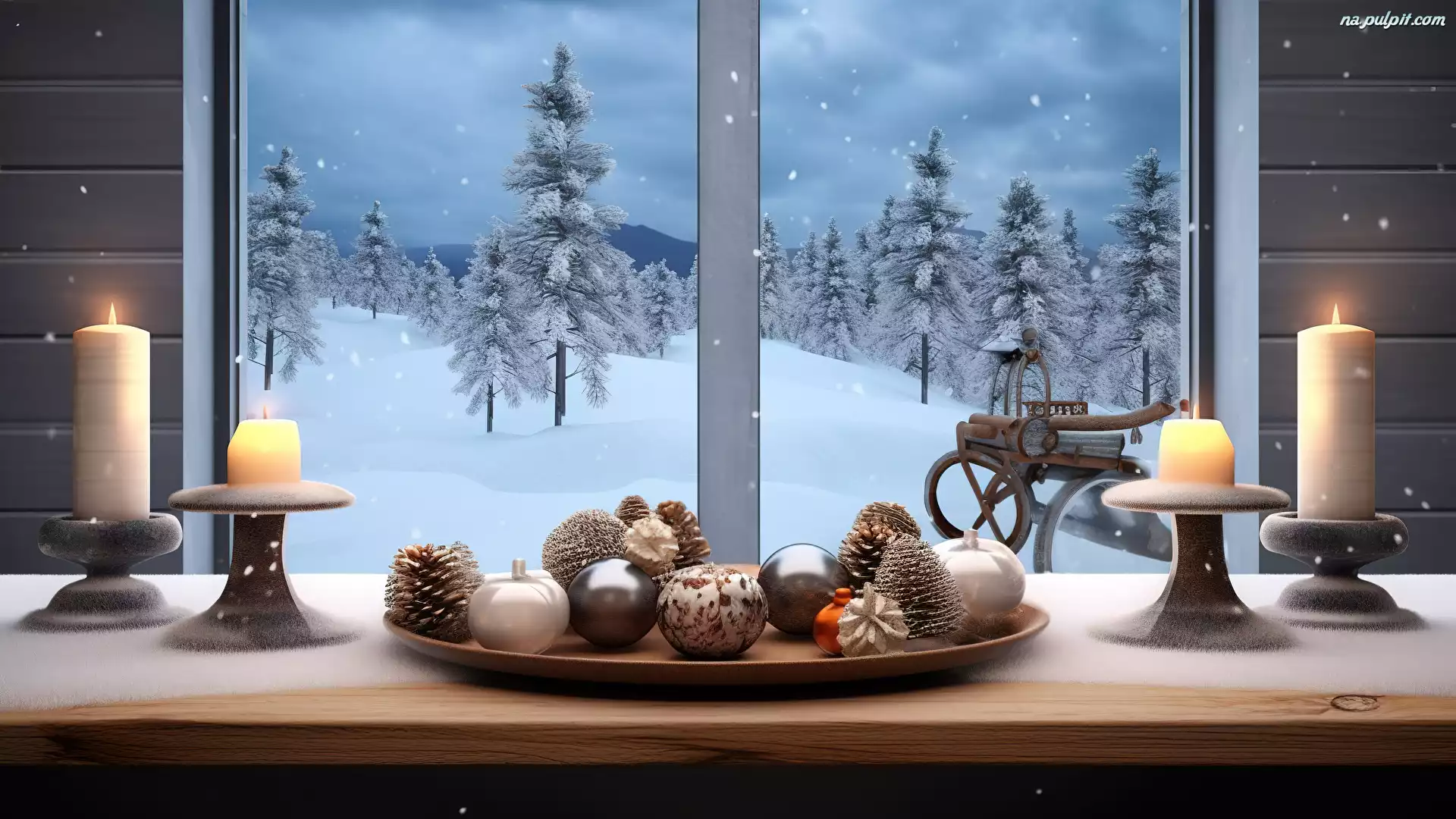 Szyszki, Ośnieżone, 2D, Zima, Stół, Taca, Okno, Drzewa, Świece, Bombki Na Pulpit