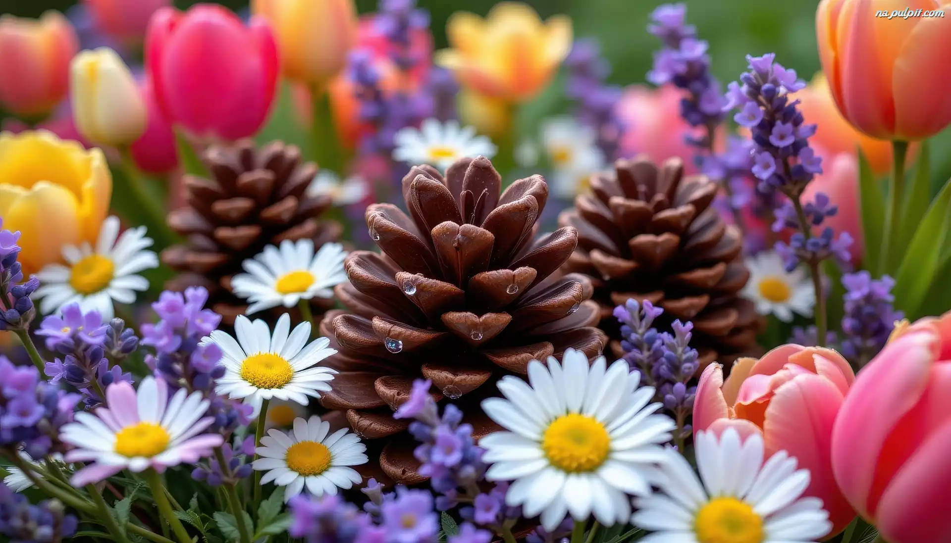 Grafika AI, Tulipany, Lawenda, Kwiaty, Kolorowe, Stokrotki, Szyszki Na Pulpit