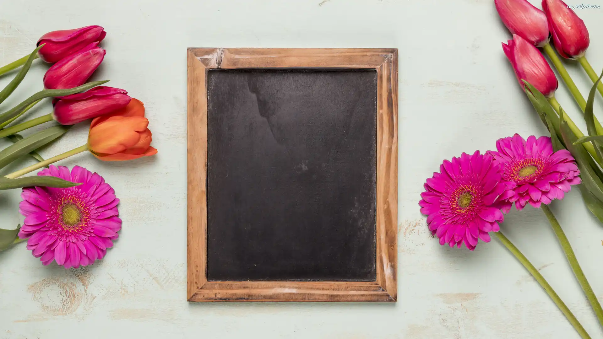 Tabliczka, Gerbery, Tulipany, Kwiaty