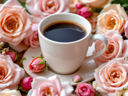 Kwiaty, Kawa, Filiżanka, Talerzyk, Biała, Róże
