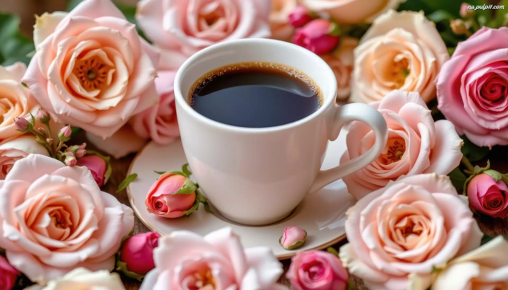 Kwiaty, Kawa, Filiżanka, Talerzyk, Biała, Róże Na Pulpit