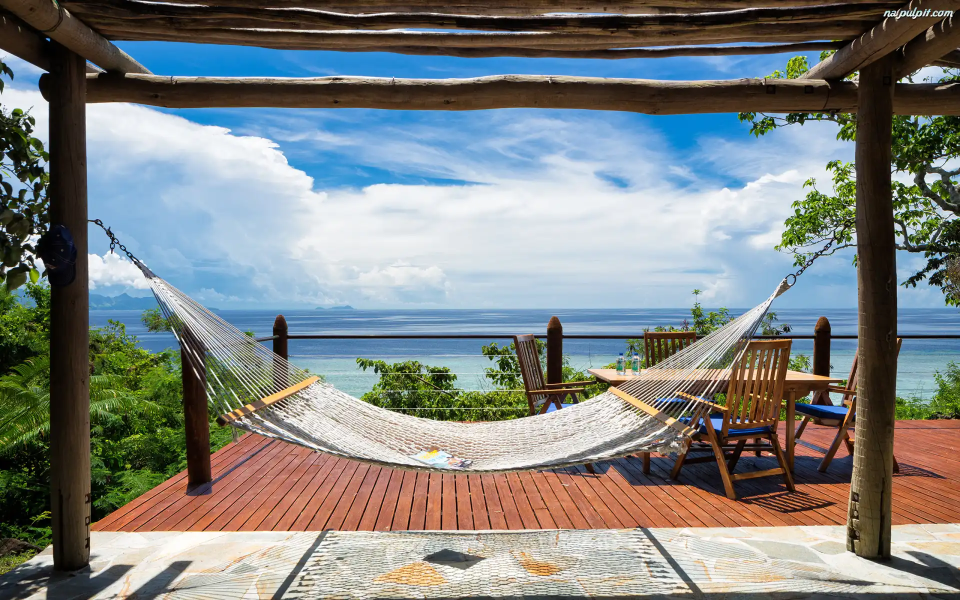 Niebo, Taras, Stół, Chmury, Wakacje, Krzesła, Hamak, Morze Na Pulpit