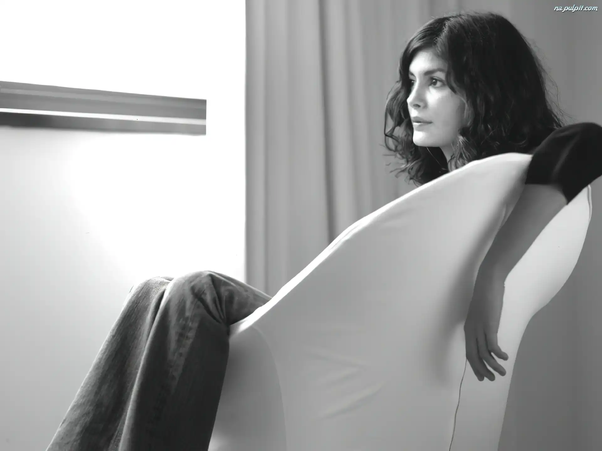 obraz, Audrey Tautou, czarny sweterek Audrey Tautou, twarz Audrey Tautou, fioletowa apaszka biały fotel, Audrey Tautou, czarna bluzka Audrey Tautou, czarna bluzka Audrey Tautou, fioletowa koszula Audrey Tautou, zamszowa kurtka Audrey Tautou Audrey Tautou, fotel Audrey Tautou, biały top jeansy, Audrey Tautou, czarna bluzka Audrey Tautou Audrey Tautou, profil niebieskie spodnie, Audrey Tautou, czarne buty