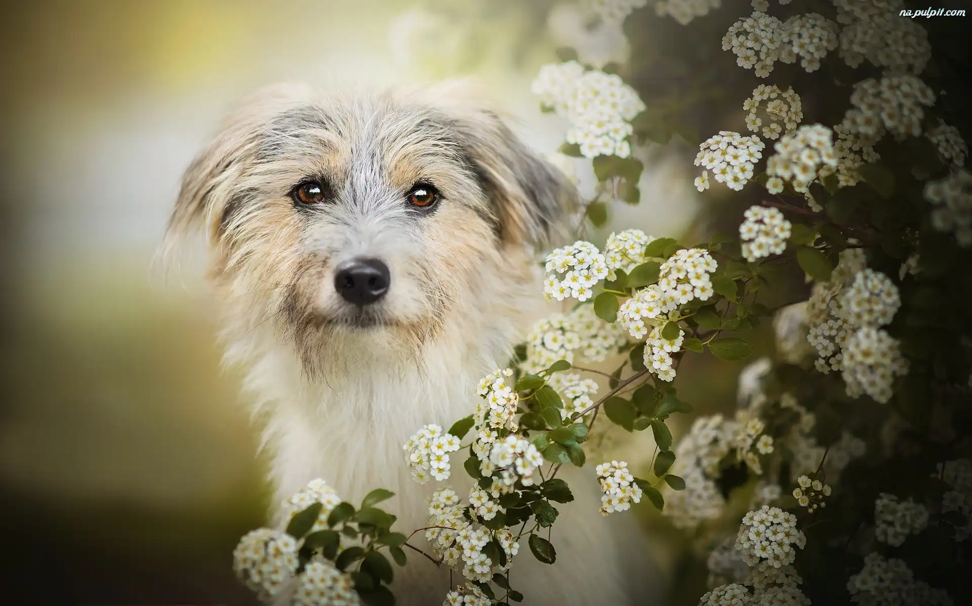 Tawuła, Kwiaty, Pies, Gałązki Na Pulpit