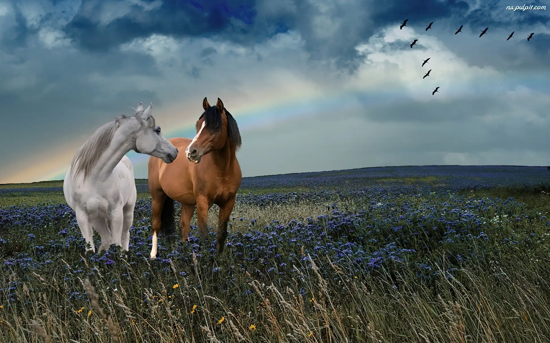 Tęcza, Łąka, Konie, Dwa, Kwiaty Na Pulpit