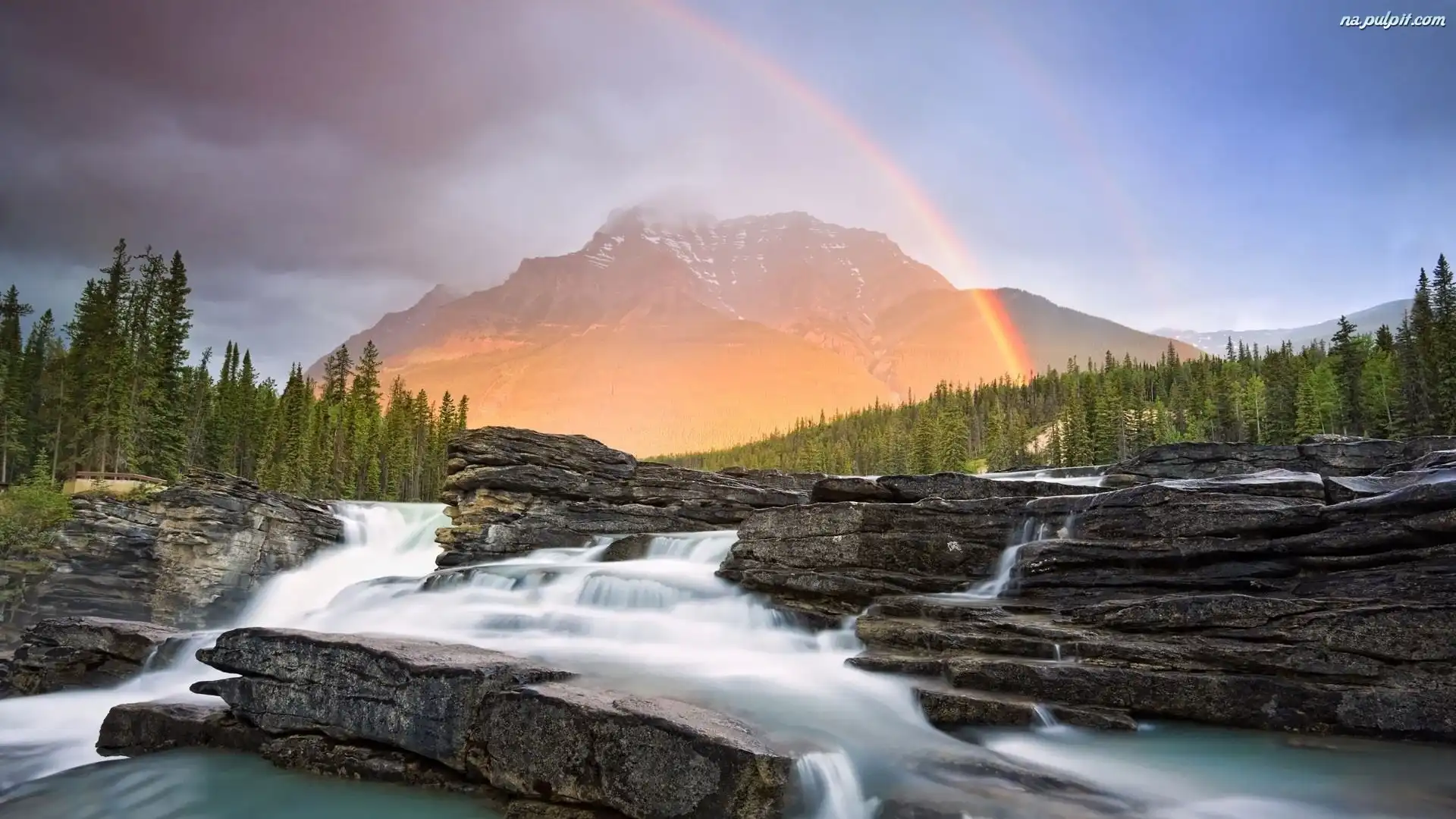 Tęcza, Las, Skały, Wodospad, Góry Na Pulpit