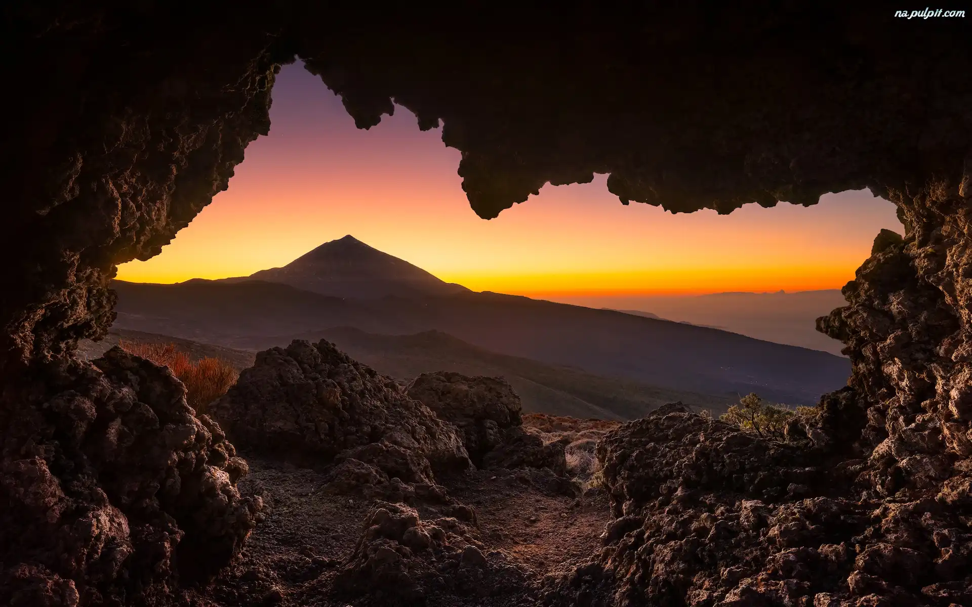 Skały, Hiszpania, Góra, Teide, Teneryfa, Zachód słońca Na Pulpit