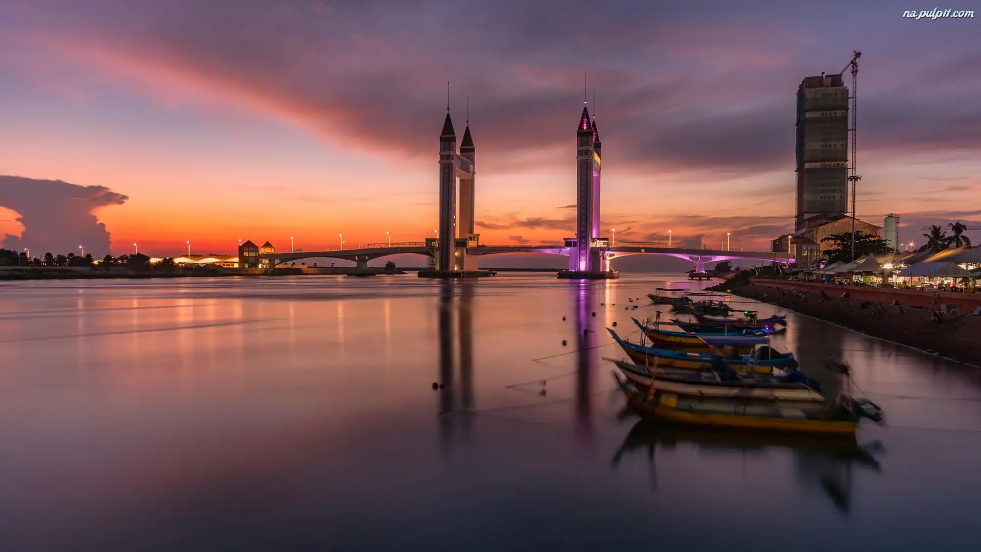 Malezja, Wschód słońca, Kuala Terengganu, Terengganu Drawbridge, Most zwodzony, Rzeka Terengganu, Łódki Na Pulpit |