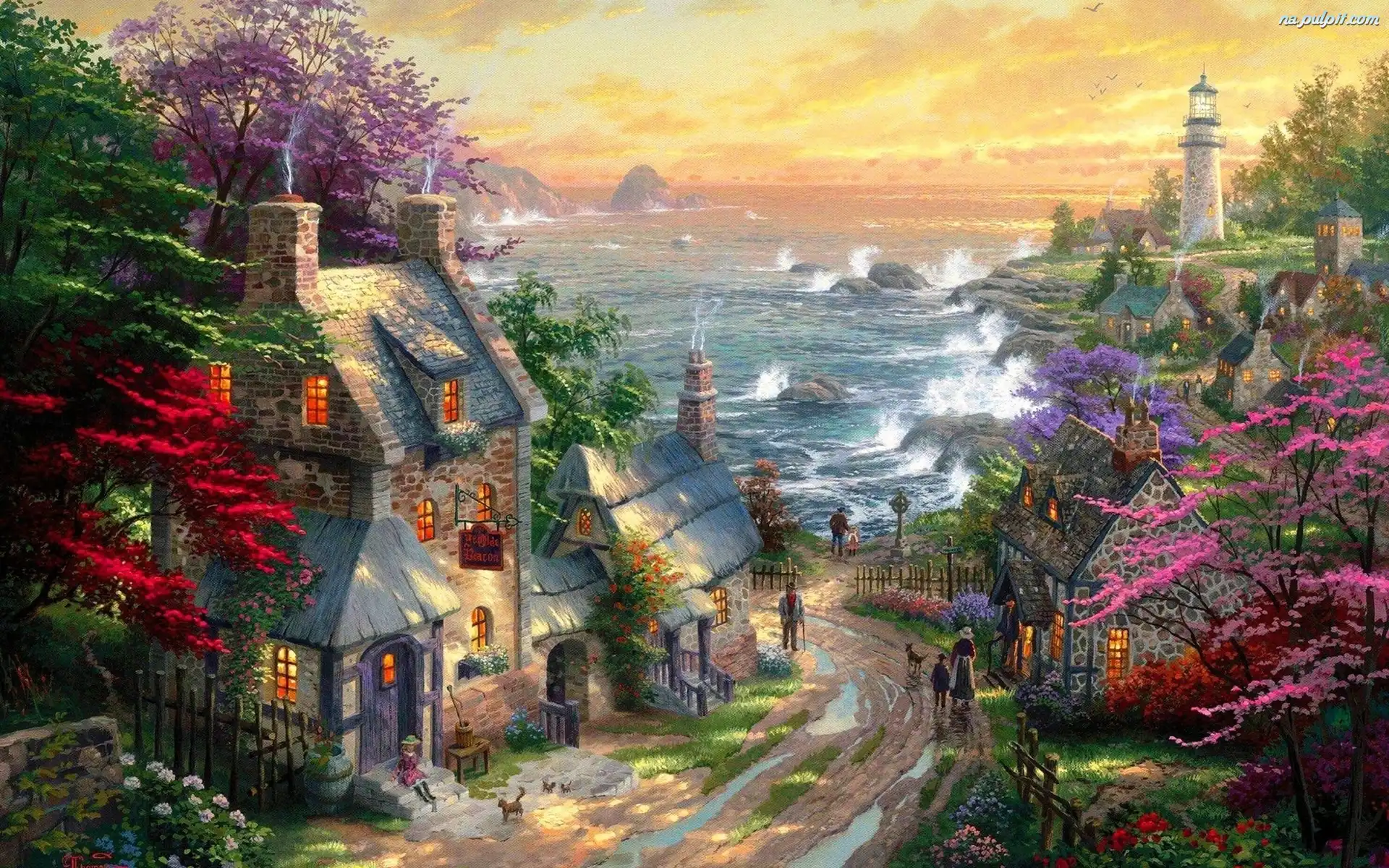 Thomas Kinkade, Wybrzeże, Domy, Latarnia Morska Na Pulpit