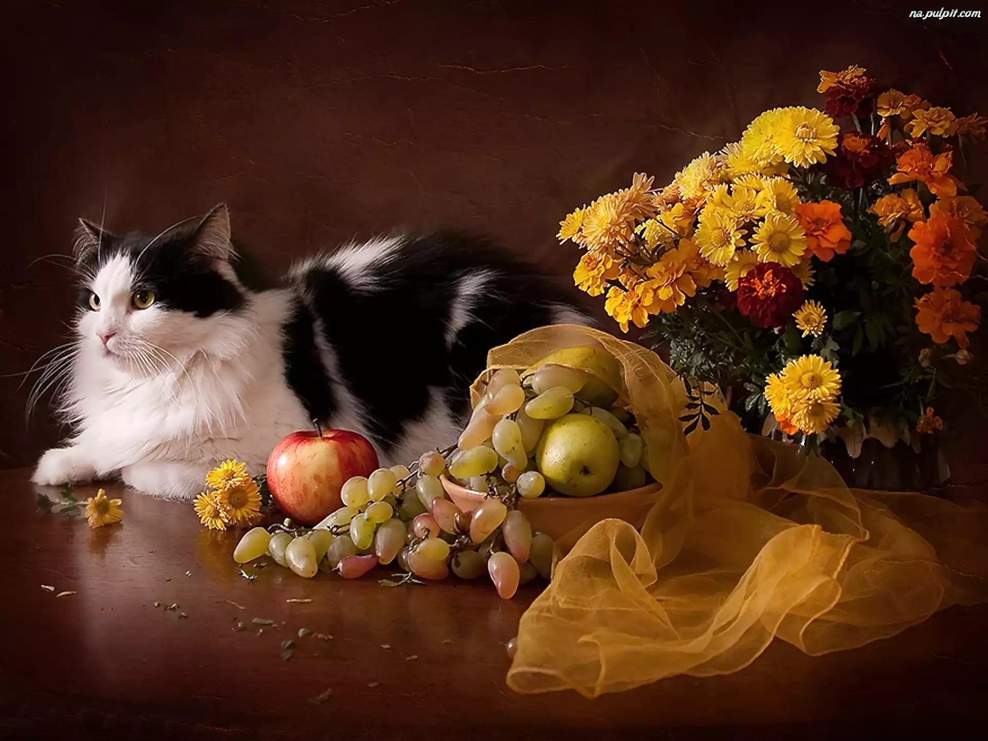 Tkanina, Kwiatów, Bukiet, Kot, Owoce Na Pulpit