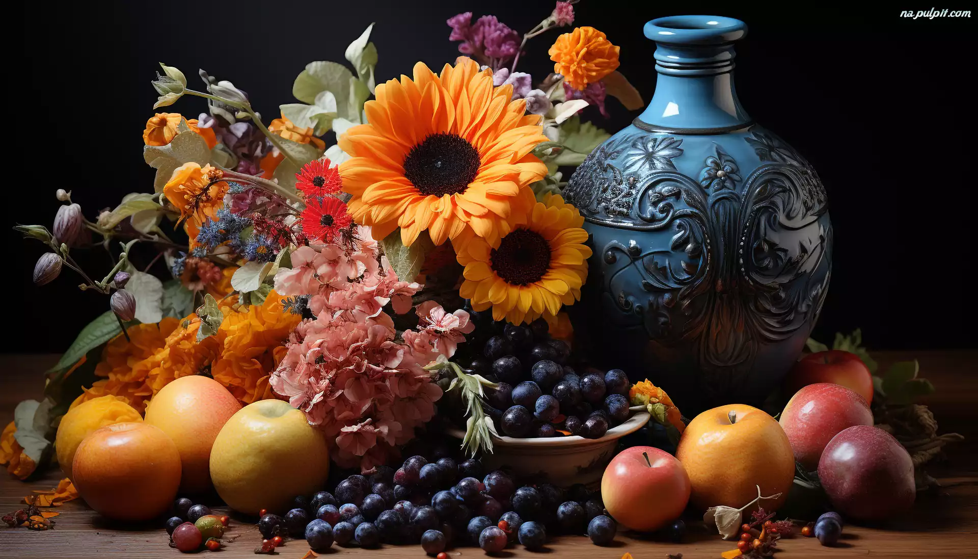 Winogrona, Grafika, Jabłka, Tło, Owoce, Czarne, Kolorowe, Kompozycja, Miska, Deski, Kwiaty, Liście, Wazon Na Pulpit |