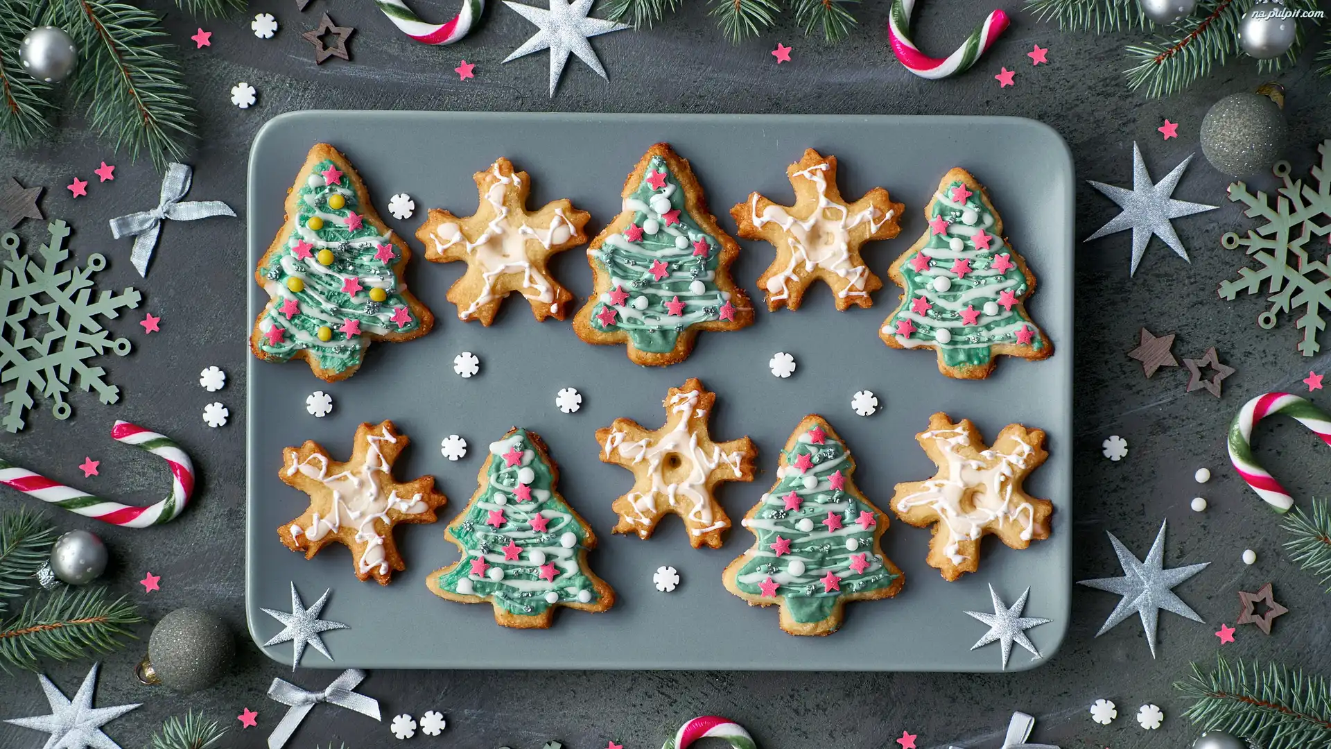 Ciasteczka, Lizaki, Tło, Pierniczki, Talerz, Śnieżynki, Szare, Bombki, Wstążeczki, Świąteczne, Gałązki Na Pulpit |