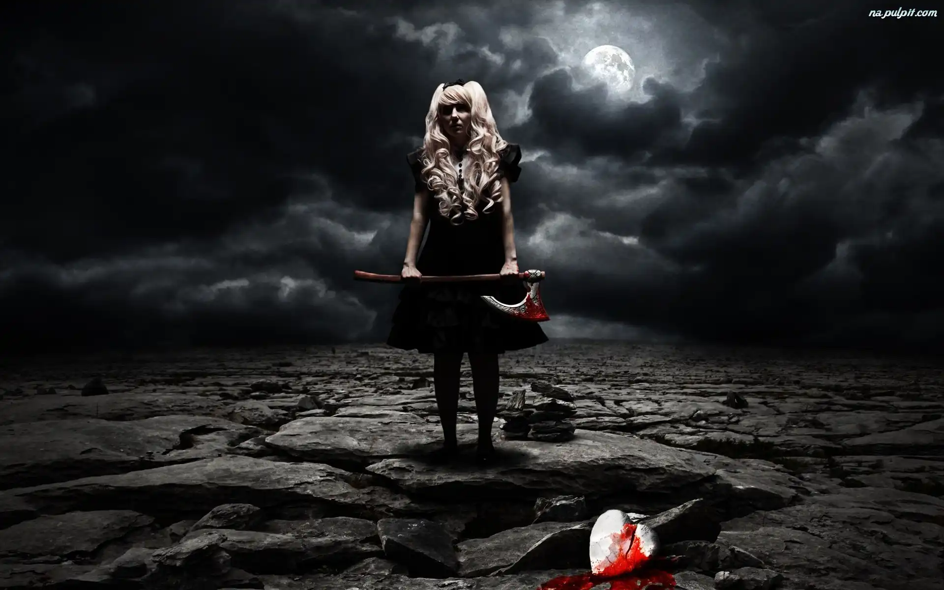 Chmury, Topór, Mrok, Krew, Księżyc, kobieta, Serce Na Pulpit