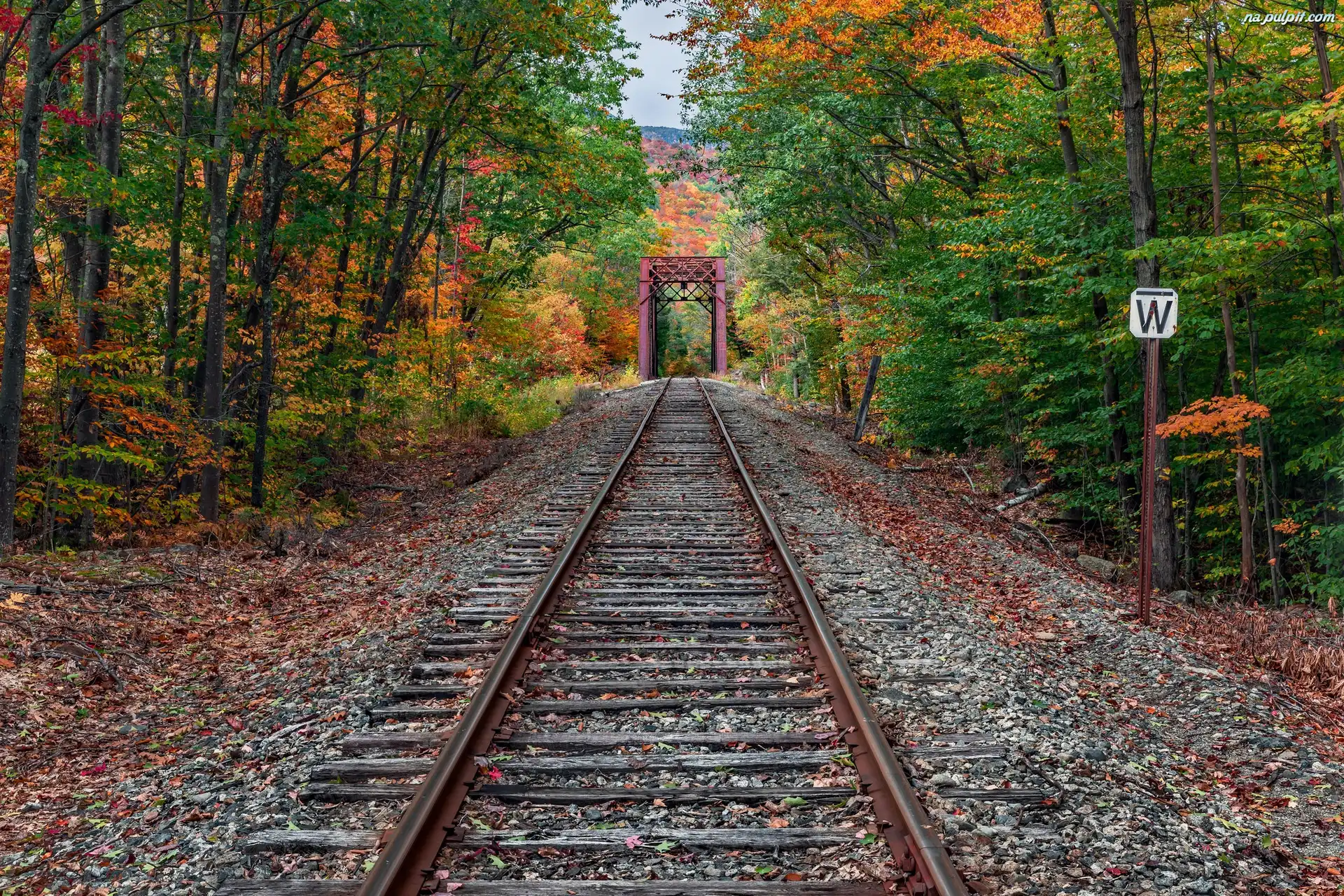 Tory kolejowe, Stan New Hampshire, Las, Most The Fourth Iron BrigdeJesień, Miasto Harts Location, Stany Zjednoczone, Jesień Na Pulpit |