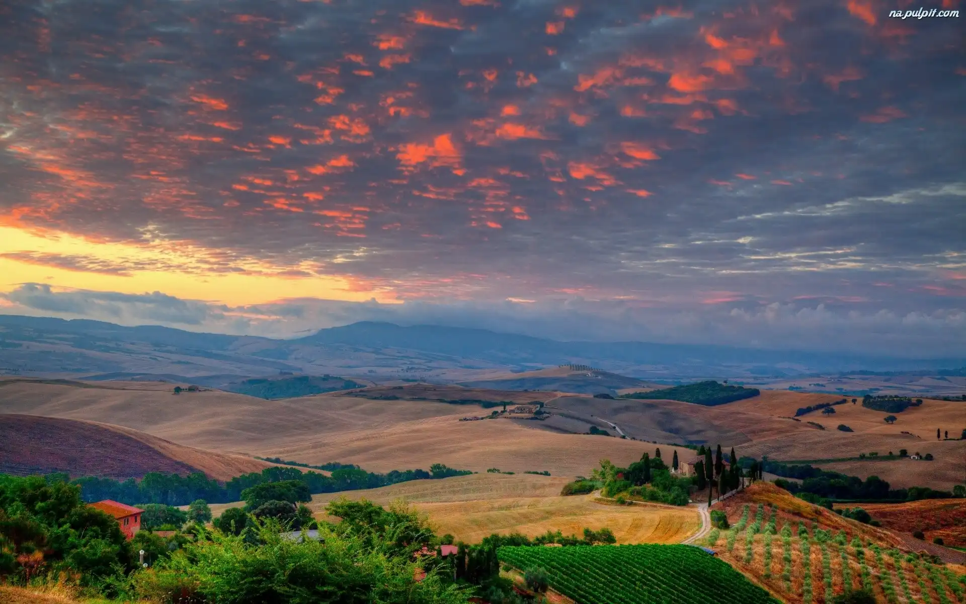 Toskania, Pola, Słońca, Zachód, Wzgórza Na Pulpit