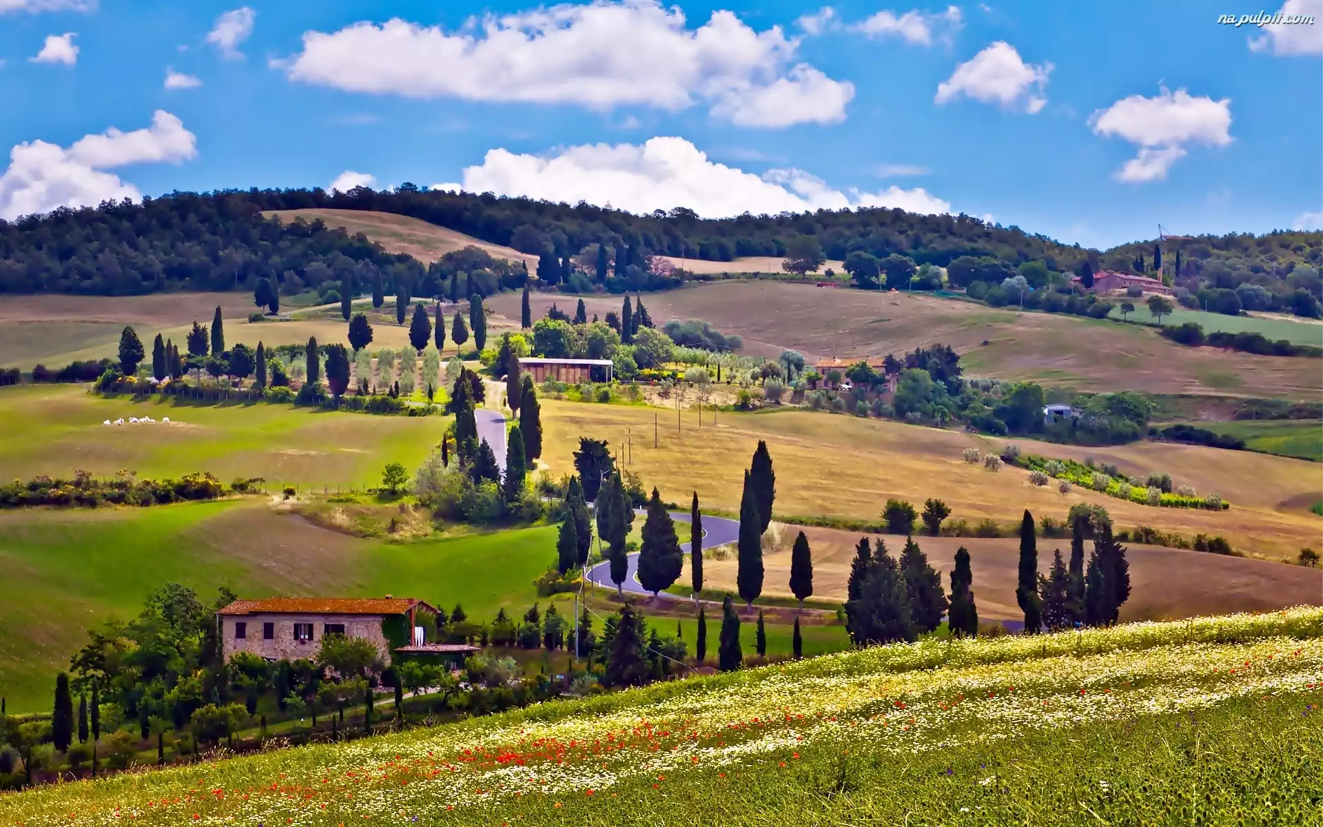 Domy, Toskanii, Łąki, Lasy, Wzgórza, Krajobraz, Pola Na Pulpit