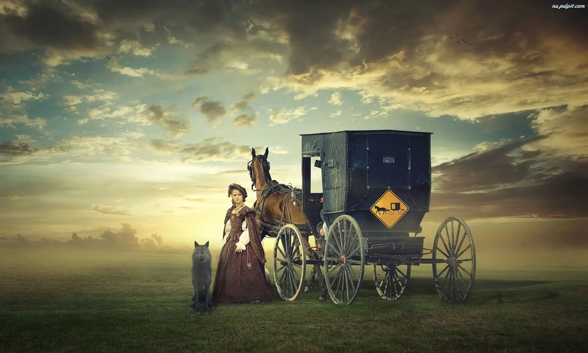 Trawa, Dziewczynka, Pies, Dorożka, Łąka, Koń