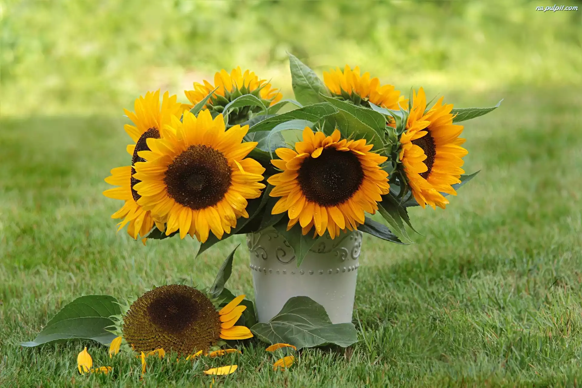 Trawa, Słoneczniki, Bukiet, Wazon Na Pulpit
