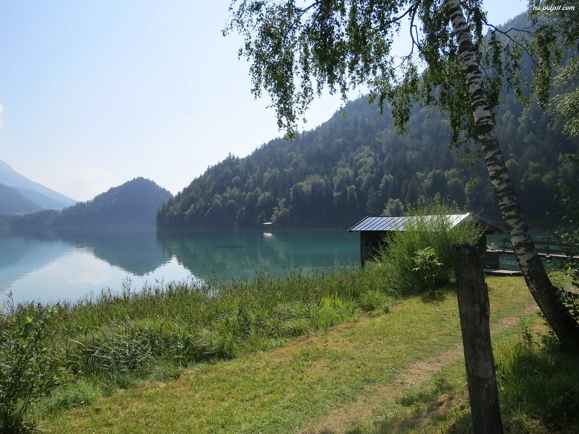 Las, Jezioro Hintersteinersee, Przystań, Drzewa, Tyrol, Austria, Brzoza, Góry, Trawa Na Pulpit