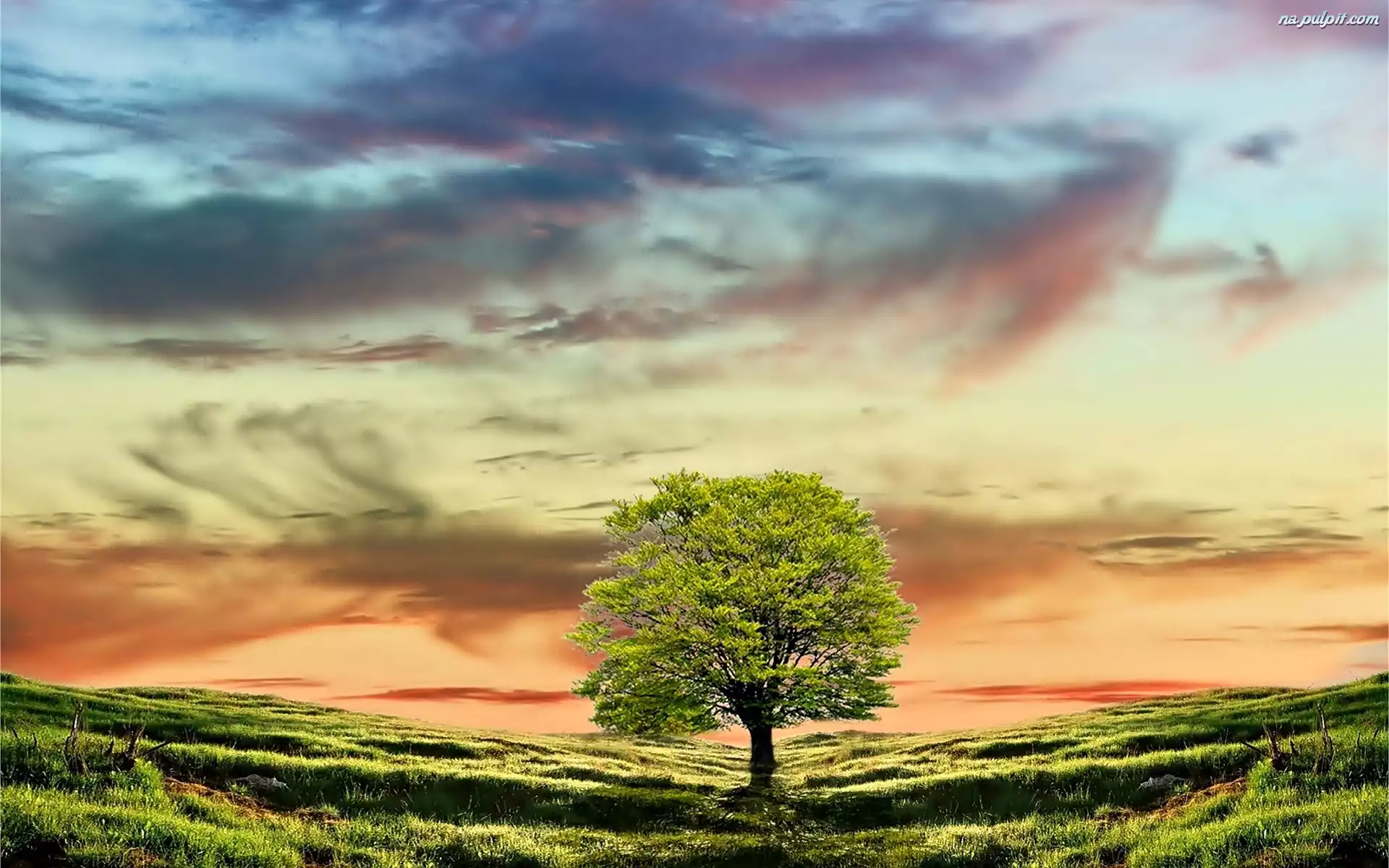Trawa, Zachód Słońca, Drzewo, Pagórki