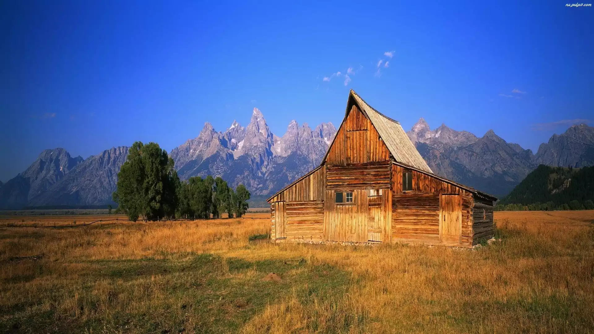 Trawa, Drewniany, Domek, Góry, Drzewa Na Pulpit