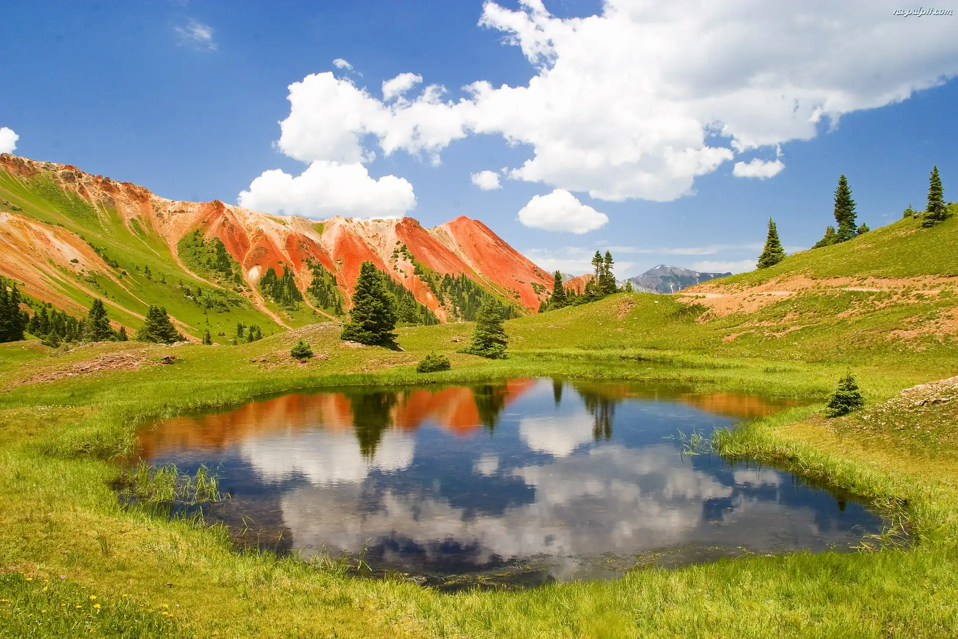 Trawa, Jezioro, Góry, Chmury Na Pulpit