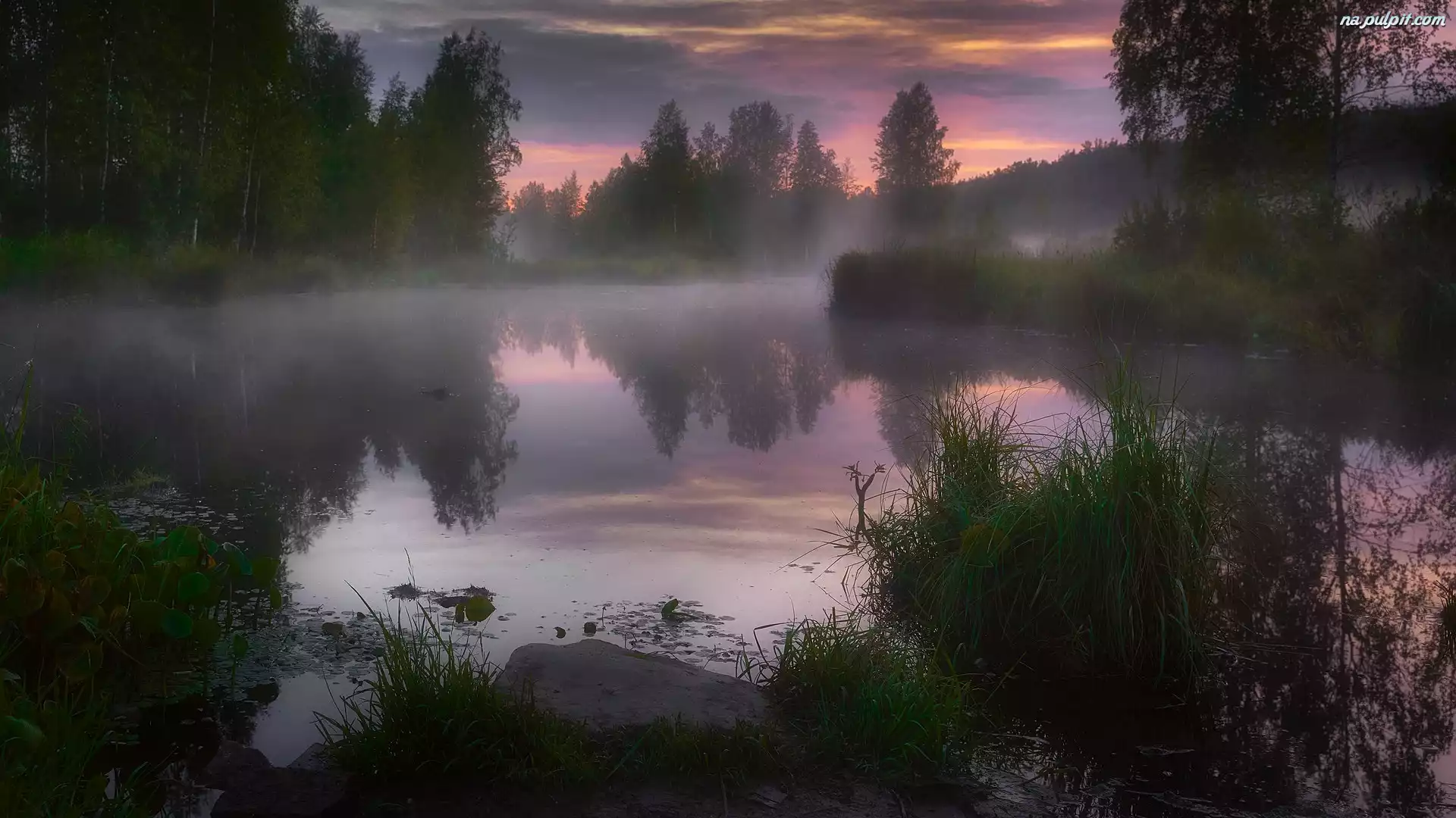 Jezioro, Trawa, Kamień, Mgła, Wschód słońca, Drzewa Na Pulpit