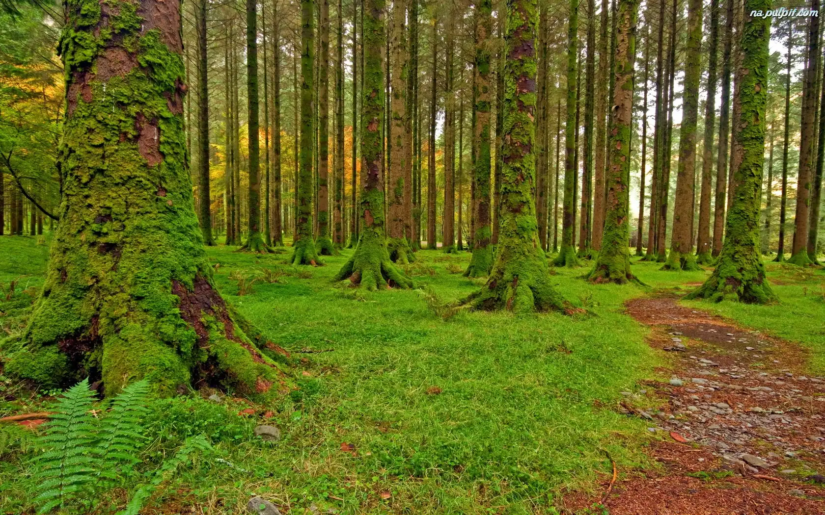 Trawa, Drzewa, Las, Mech
