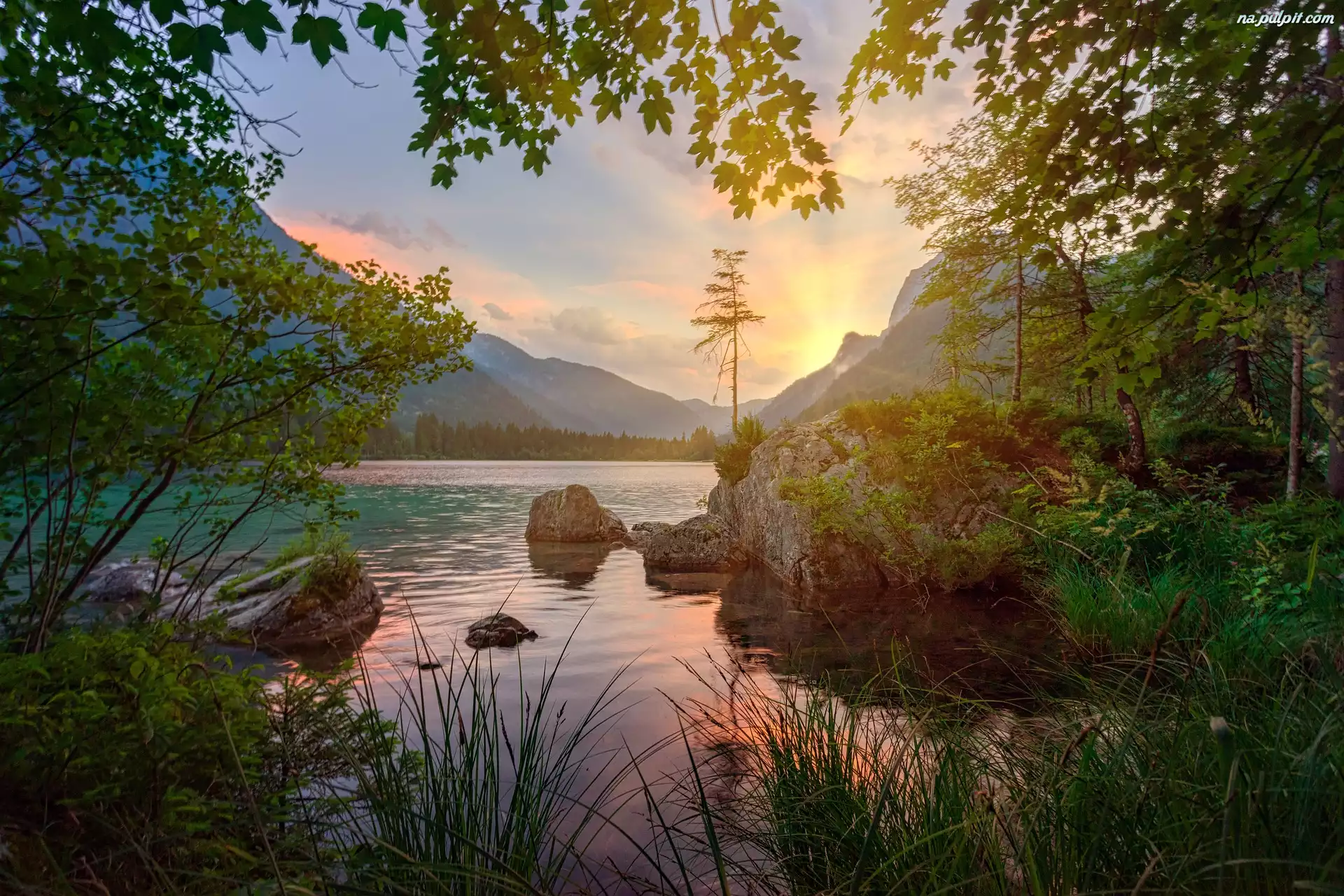Trawa, Drzewa, Gałęzie, Góry, Zachód słońca, Niebo, Jezioro, Kamienie Na Pulpit