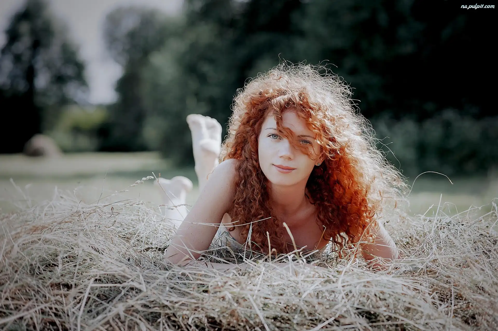 Trawa, Włosy, Kręcone, Rudowłosa, Łąka