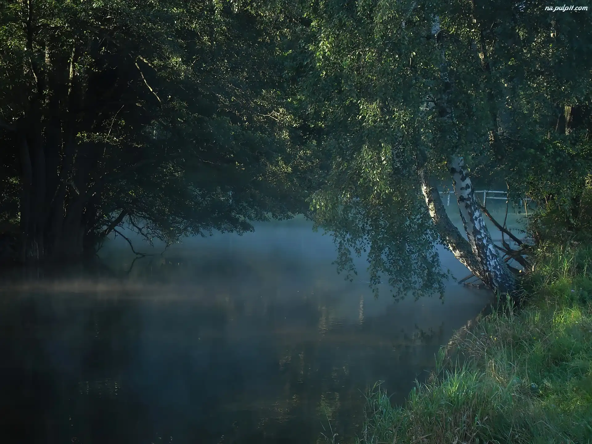 Trawa, Brzoza, Mgła, Rzeka, Liście Na Pulpit
