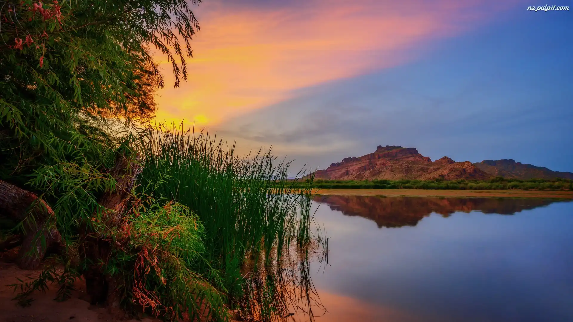Skaliste, Trawa, Zachód słońca, Góry, Jezioro, Drzewa
