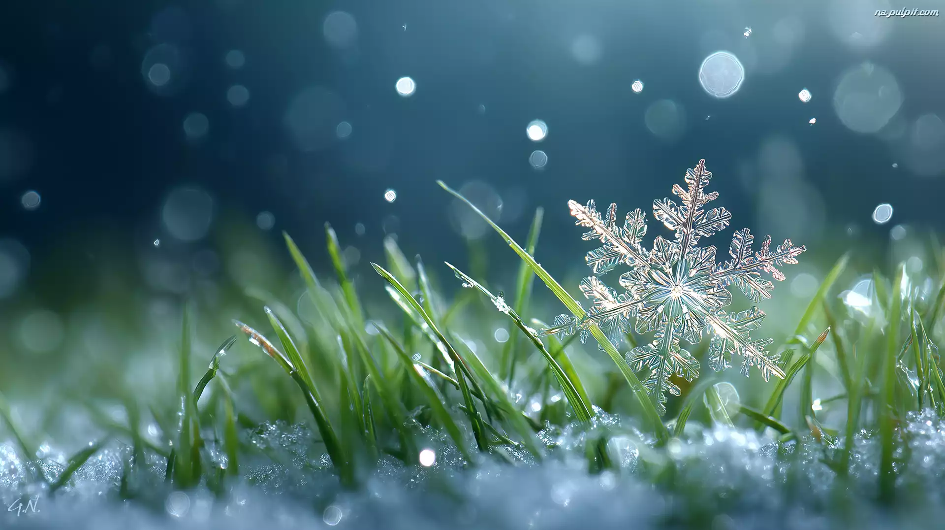 Śnieżynka, Trawa, Śnieg, Grafika AI Na Pulpit