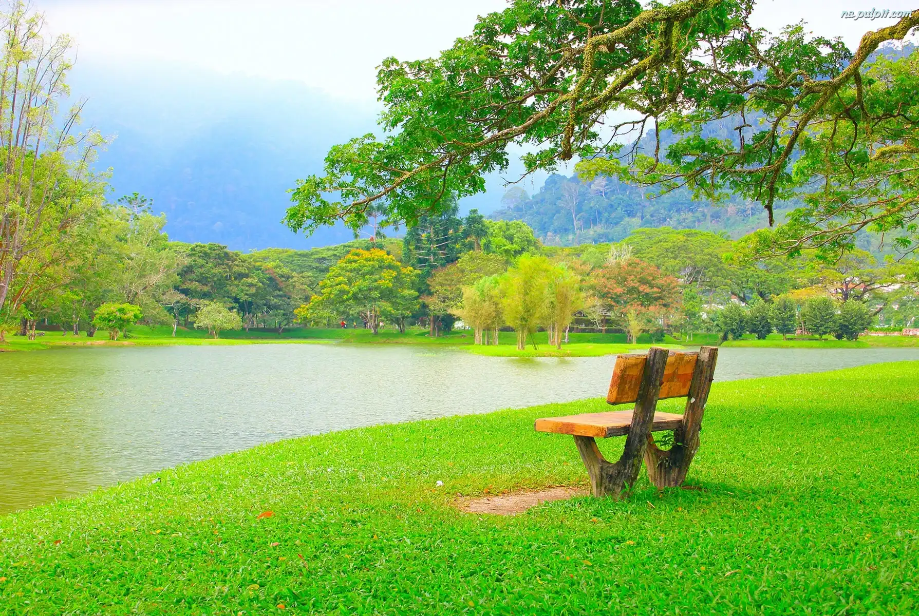 Trawa, Drzewa, Staw, Ławka Na Pulpit