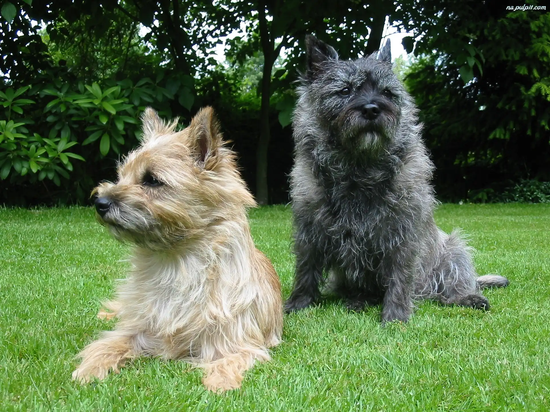 Trawa, Cairn Terrier trawa, Cairn Terrier, zielona Cairn Terrier, słodkie, trzy, szczeniaki szare, umaszczenie, Cairn Terriery, pszeniczne Dmuchawce, Cairn terrier, Pies, Łąka