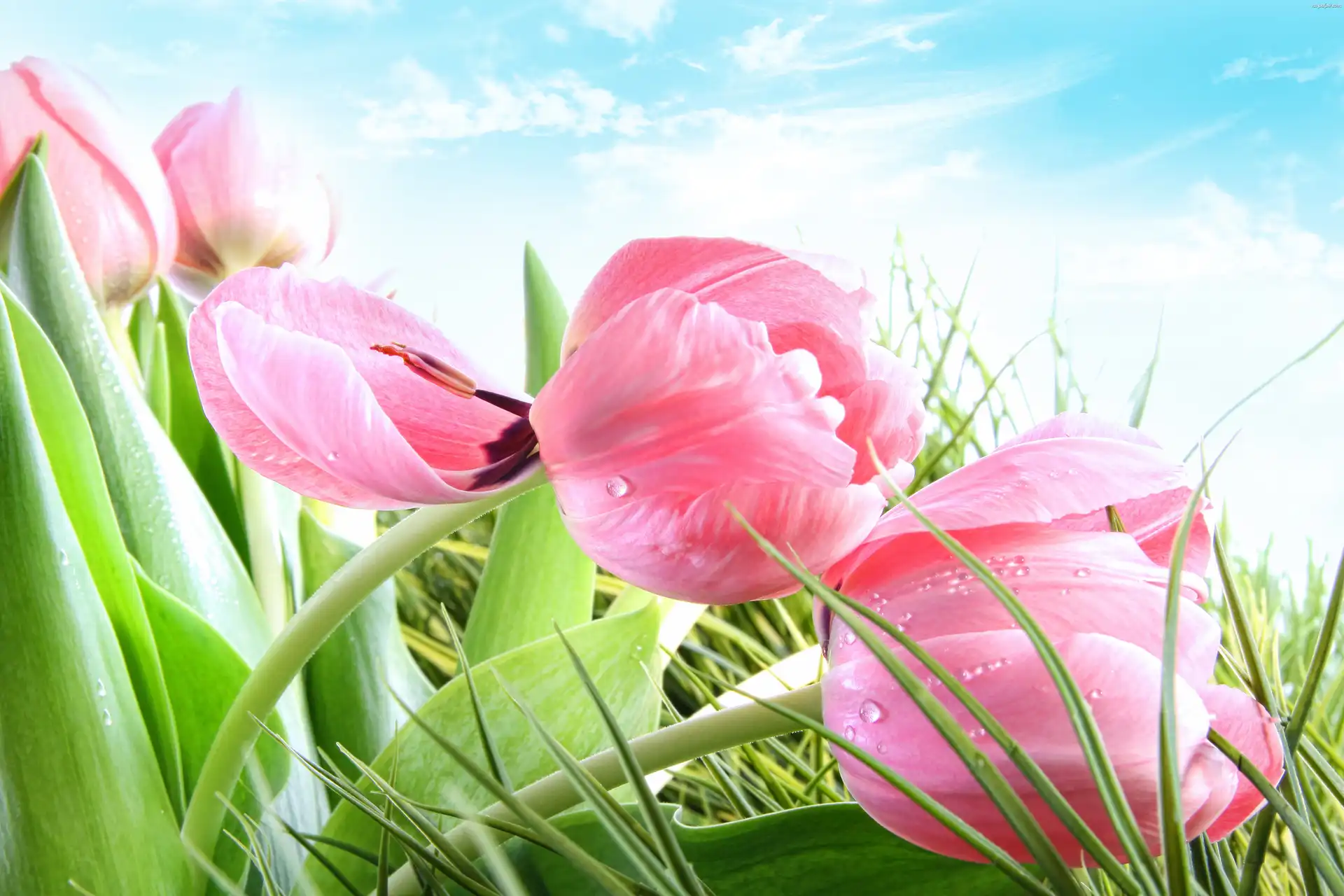 Tulipany, Trawa, Różowe