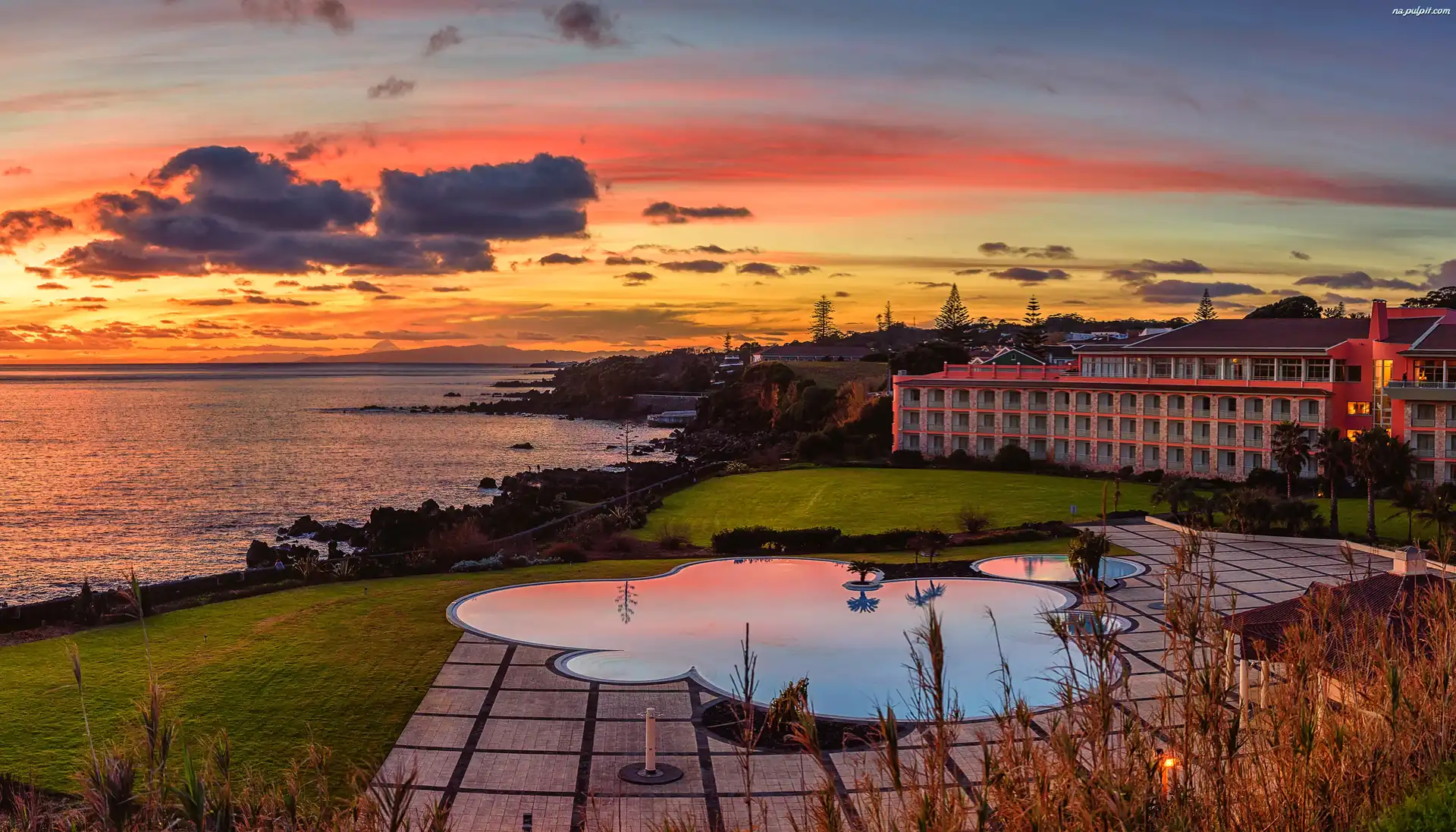 Willa, Trawa, Zachód Słońca, Morze, Basen, Krzewy Na Pulpit