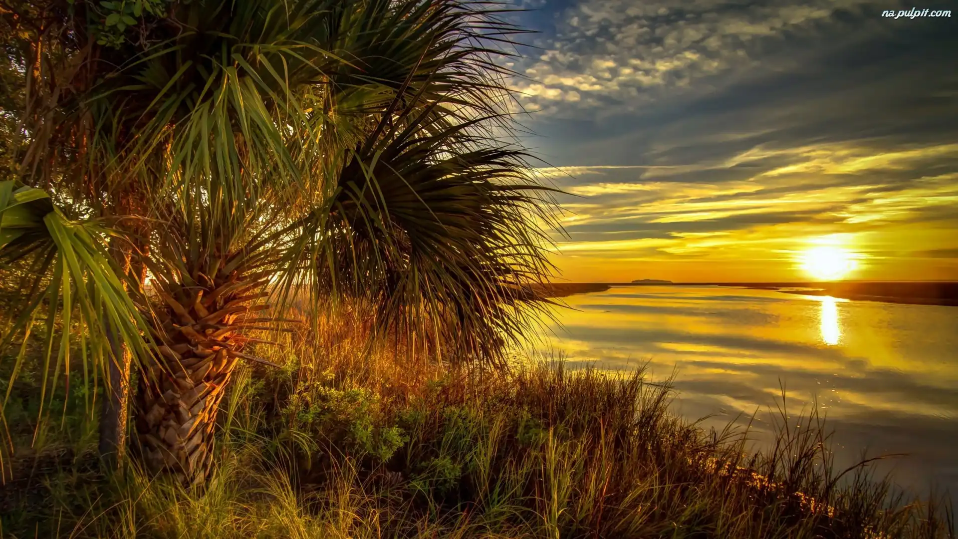 Trawa, Palma, Jezioro, Wschód Słońca Na Pulpit