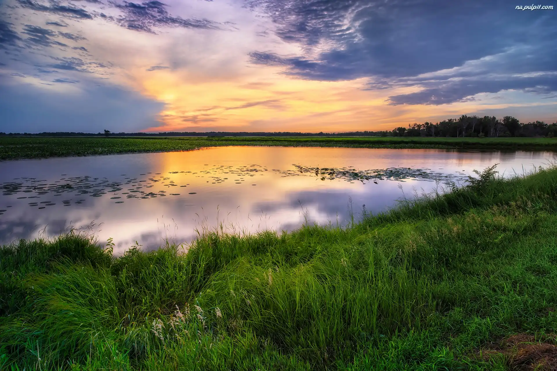 Trawa, Jezioro, Zachód słońca Na Pulpit