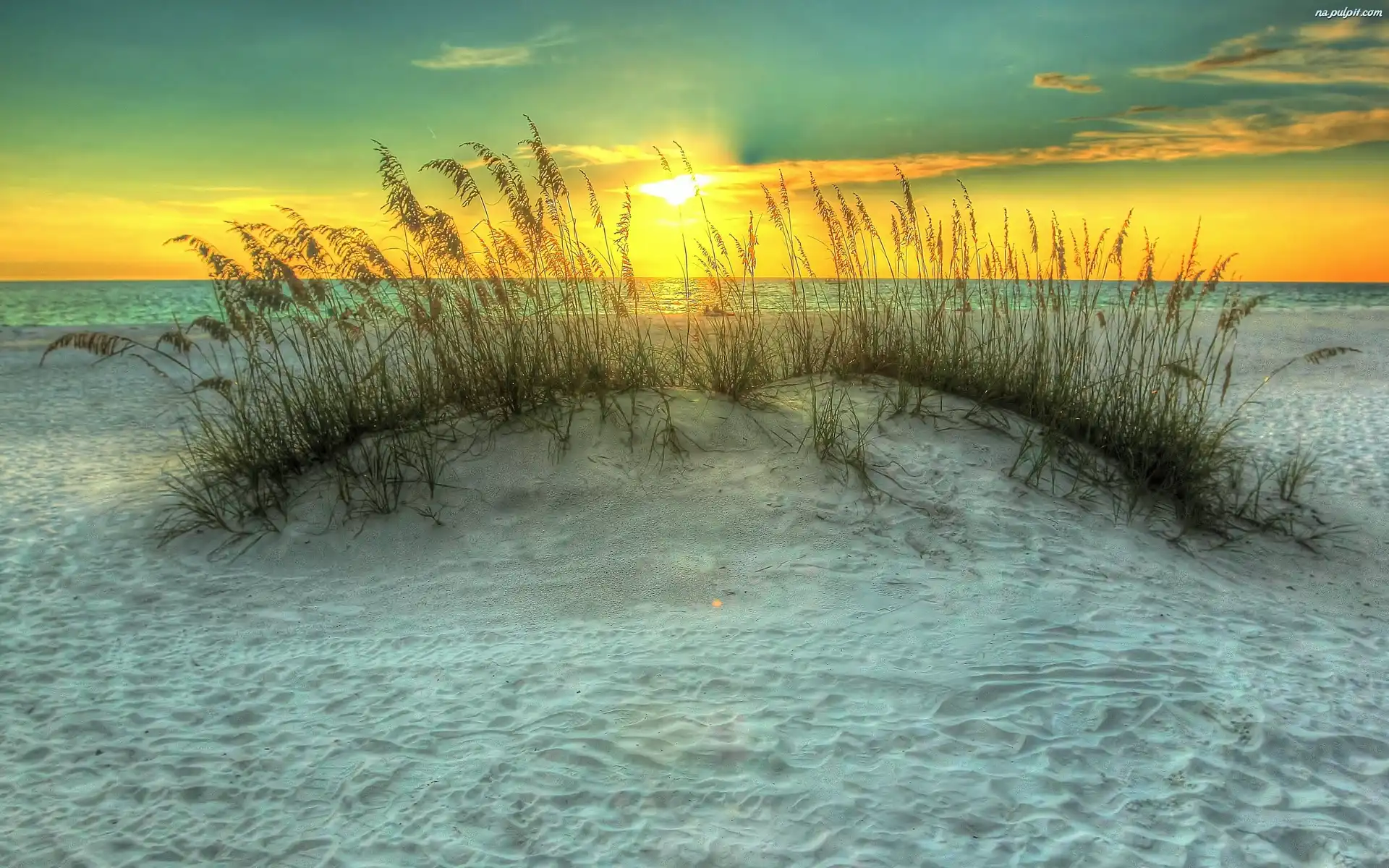 Trawa, Morze, Słońca, Zachód, Plaża Na Pulpit