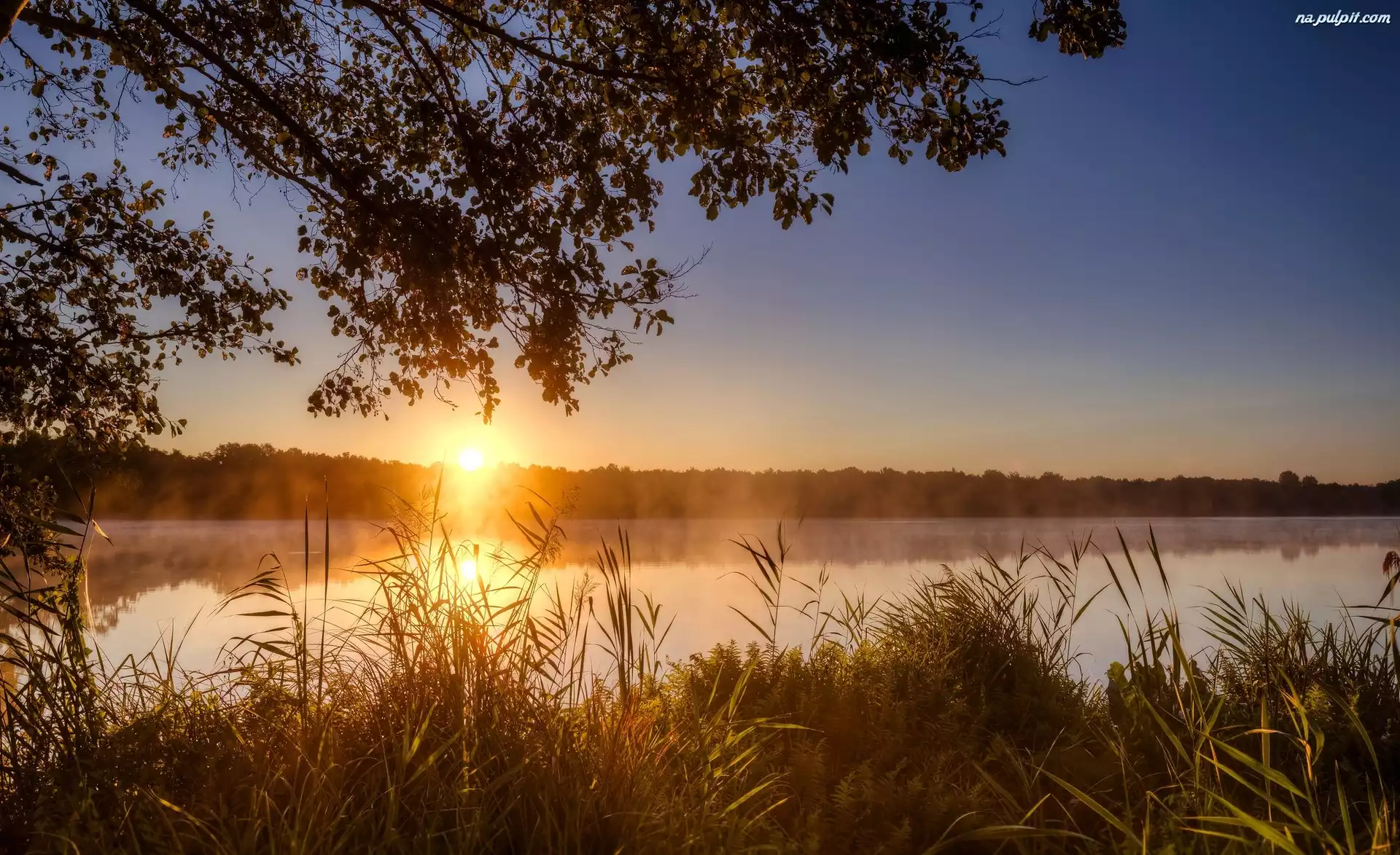 Trawy, Wschód słońca, Mgła, Jezioro, Drzewa Na Pulpit