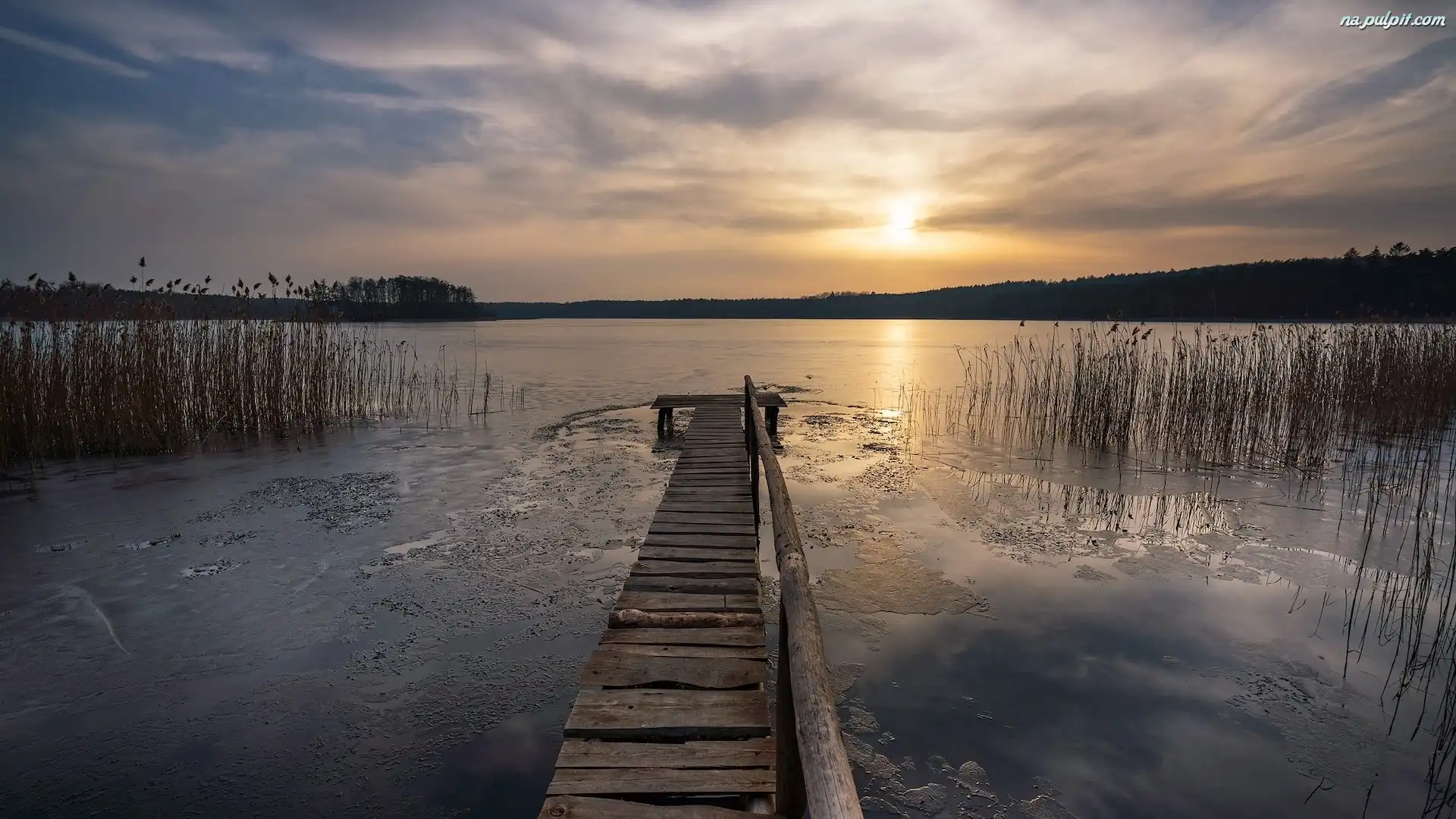 Trawy, Zachód słońca, Jezioro, Pomost Na Pulpit